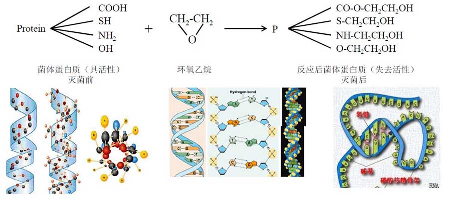 環氧乙烷在作用時,其環狀結構斷裂,經羥化,與菌體內蛋白質上的氨基、羧基、羥基等活性基團烷基化作用,使酶代謝過程發生障礙,從而破壞菌體的新陳代謝,造成微生物死亡,達到殺菌的目的。
