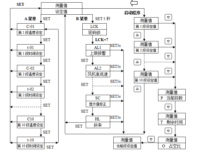 2. 按程序設定說明的操作步驟,設定所需工作溫度,即測量值顯示“C-01”時,按需設定溫度,測量值顯示“t-01”時,將時間設定為**大值“999”,將“t-02”**“t-10”設為“0”,再恢復到正常顯示狀態;