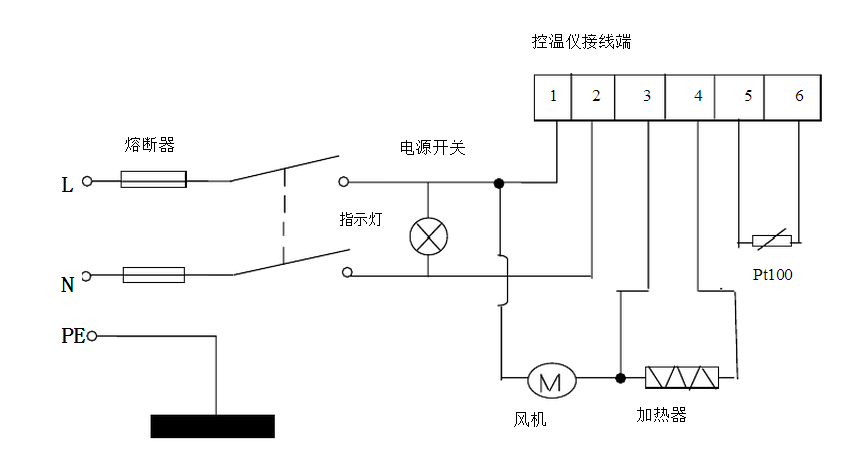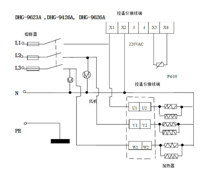 6、DHG-9623A,DHG-9426A,DHG-9626A型號的設備工作電源為三相五線制,電源插頭接A,B,C三相380V電壓及N零線,保護接地線接入設備外殼上專用接柱。
